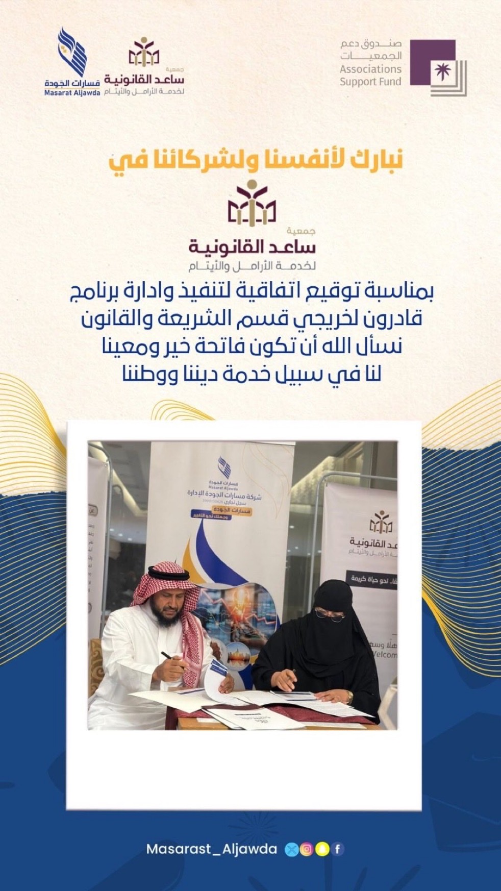 سعدنا بتوقيع اتفاقية مع شركة مسارات الجودة @saeiidorgلتنفيذ برنامج نوعي لخريجي تخصصي الشريعة والقانون(قادرون) بهدف تمكينهم بالمعارف التطبيقية والمهارات المهنية التي تعزز حضورهم في سوق العمل وتدعم مسيرتهم في خدمة العدالة والتنمية المجتمعية بدعم كريم من @asfgovsa #وجهتك_نحو_التغيير #تمكين_الخريجين #الشريعة_والقانون #شراكة_فاعل